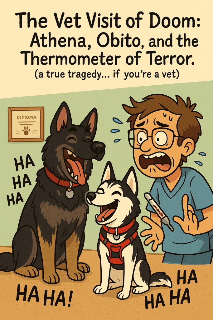 It all started at precisely 7:38 a.m., when the universe made a catastrophic error, scheduling both Athena and Obito for a joint vet appointment. This was not just any vet visit. No. This was The Annual Checkup, the dreaded day when the dogs get poked, prodded, weighed (a sensitive subject for Obito), vaccinated, and most importantly thermometered. The house that morning was a swirling maelstrom of tension, dog hair, and suspicious side-eyes. Athena, the husky of grace and vengeance, immediately knew something was off when her breakfast was served early and involved the words “Come here, Princess” said in that high-pitched, fake-cheerful human voice usually reserved for tricking dogs into bathtubs. She looked the human square in the face and barked once. Loudly. In fluent profanity. Obito, meanwhile, was excited beyond measure. He thought they were going to the park. He pranced around with his leash in his mouth, smacking himself repeatedly in the eyeball but smiling the whole time. This is a dog who greets bees with kisses. He was ready. Munchkin the tabby cat, watching from atop the fridge like the godfather of household trauma, gave a slow blink that said, “You’ll never return whole.” Off they went. The car ride was uneventful, if you ignore the fact that Athena attempted a full jailbreak at a red light and Obito somehow got his entire head stuck in a cupholder. But then... they arrived. The VETS. Athena froze. She squinted at the building like it owed her money. Obito happily waltzed in, immediately peed on the plastic plant, and knocked over a display of “dental chews for sensitive gums.” He then tried to eat one wrapper and all while making aggressive eye contact with the receptionist. Athena refused to cross the threshold. She did the full brake, paws splayed, back arched, deadweight mode activated. It took two humans and the promise of cheese to convince her to enter. She glared the entire time. Royal. Righteous. Ready to sue. In the waiting room, chaos unfurled. Athena whined a slow, dramatic, operatic dirge. A husky ballad of betrayal and doom. Obito was trying to kiss a Great Dane the size of a motorcycle. The Great Dane looked offended. Obito sneezed in his face. Somewhere, a child cried. Then, a voice: “Athena and Obito?” The nurse had no idea what she had just summoned. Obito sprinted in, tail wagging like a helicopter about to take off. Athena had to be dragged in sideways like a defiant noodle. First: the scale. Obito: 110 pounds of love, fluff, and regret. He flopped onto the scale like a walrus giving up on life. The vet tech wrote it down and said, “He’s... healthy.” Athena: 52 pounds of fury. She stood on the scale with the elegance of a supermodel, but made eye contact that said, “I will end your career.” Then came the exams. Athena refused to sit. She laid down in the most inconvenient spot and flailed anytime a thermometer came near her royal rear. It took three people, one jar of peanut butter, and a Bluetooth speaker playing whale noises to convince her to stop growling at the stethoscope. Obito, meanwhile, LOVED the attention. He licked the vet’s face. He licked the nurse’s face. He licked the floor. He licked Athena. Athena growled. Obito licked the air. He was living his best life. Then the vet said the words: “Time for the temperature check.” Athena stood up so fast the peanut butter jar flew. She ran a lap around the exam room, leapt over the counter, and knocked over a skeleton model of a dog. Obito thought it was a new friend and tackled it with glee. The vet, bless her soul, was patient. But the thermometer remained untouched. It became a standoff. Athena stared. The vet stared. Obito licked the vet’s shoe and farted. Eventually, with the cunning of a Bond villain, the vet distracted Athena with a cheese treat and... boop. Thermometer deployed. Athena yodeled. The entire building heard. A poodle in the next room fainted. Vaccinations followed. Obito didn’t notice. He was busy trying to seduce a bag of kibble on a shelf. Athena took hers with the same expression a queen might have while being slapped with a fish. Pure disdain. By the end, the vet looked like she’d aged ten years. The exam room looked like a frat party had been held there, fur everywhere, a spilled jar of treats, a broken poop bag dispenser, and somehow, inexplicably, a single Croc shoe in the sink. The bill was paid. Apologies were mumbled. Obito peed on another plant. Munchkin was watching from the living room window when they returned, absolutely radiating smug satisfaction. Athena sulked for hours under a pile of stolen laundry, refusing to make eye contact. Obito passed out mid-lick on the floor, snoring like a hairy leaf blower. And somewhere, in a vet’s office far, far away, a group of professionals quietly placed a note in their file: “Caution: Drama Queen and Emotional Marshmallow. Recommend sedation or priest.”
