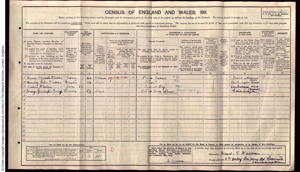 On the eve of the 1911 census, which was completed on Sunday, the 2nd of April 1911, Robert Wallace, his mother Maude Elizabeth, his sister Dorothy Helen, and their companion Mary Gillespie Godby were settling into their six-room home at Number 3, Wynberg Terrace, Henry Road, Shirley, Freemantle, Southampton. The house was a quiet place, marked by the absence of Robert's father, John, who had passed away the previous year. Maude, now a widow, was doing her best to keep the family afloat, living off private means, just as Mary Gillespie Godby, a retired sick nurse, did as well.