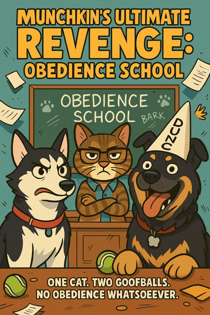 It began with a mood. Not just any mood, but the smug, tail-flicking satisfaction of one tabby cat named Munchkin, perched like a furry dictator on the back of the couch. He had not forgotten being listed on eBay by his two canine siblings. Not forgiven. And certainly not moved on. No, Munchkin was a cat with a plan. A plan involving revenge, humiliation, and, of course, banana-flavored liver treats. Athena was sprawled regally across the carpet, dramatically draped in her favorite throw blanket like some disgruntled queen without her throne. Obito, her oversized and ever-goofy malamute brother, was chasing his own tail and occasionally knocking into furniture. As always, his smile suggested he’d just licked a power outlet and liked it. In the other room, the humans were distracted by Zoom calls and attempting to function like adults. This was the window of opportunity. Munchkin leapt onto the human’s laptop, typed with the grace of a caffeinated squirrel, and registered both dogs for Pawfect Pup Obedience School. The confirmation email included phrases like “structured discipline,” “positive reinforcement,” and “surprise agility tunnels.” It was only when the car ride began, filled with cheerful human voices promising fun and enrichment, that Athena grew suspicious. She glared at Obito, who was gleefully fogging up the windows with his panting. He had no idea what was coming. Neither of them did. They arrived at obedience school to the dulcet tones of ambient pan flute music and the stench of over-sanitized tragedy. The floor was polished to a squeaky shine, cones were ominously placed in patterns suggesting ritual sacrifice, and a Labrador named Bartholomew stood perfectly still, wearing a bowtie and the dead-eyed look of someone who had given up months ago. Athena recoiled in horror. Obito barked joyfully and tried to mount a potted plant. A woman appeared out of nowhere, like a sitcom side character with way too much backstory. This was Miss Cheryl. She wore bedazzled Crocs and a utility vest full of clickers and judgement. "Welcome, puppies!" she trilled, and clicked a clicker as if summoning demons. Obito, naturally, thought it meant snacks and immediately sat, then laid down, then rolled over, then burped. Athena refused to sit. She locked eyes with Miss Cheryl in a showdown that could have set fire to dry grass. When coaxed, Athena responded by dramatically collapsing to the floor and moaning like a ghost with unfinished business. Things escalated quickly. Miss Cheryl introduced the training leash, a retractable pastel insult to dignity with tiny daisies on the handle. Athena took one look and began limping theatrically, dragging her paw as if she’d been wounded in an emotional war. Obito tried to eat the leash, accidentally wrapped it around a stool, and managed to tie himself to a mop bucket. They were given demerits. Miss Cheryl had a whiteboard. The tally marks multiplied. The class ended with banana-flavored liver treats. Obito inhaled his and then attempted to inhale the entire treat pouch. He knocked over a chair, got a treat stuck in his lip, and still grinned like he’d just won a Grammy. Athena sniffed hers, then looked up at Miss Cheryl as though she'd been handed a wet sock and told it was caviar. On the way home, Obito slept deeply, his leg twitching with dreams of tunnels and treats. Athena sat upright, staring out the window, plotting Munchkin’s downfall with the focus of a wolf general. She had not forgotten. She would not forgive. They entered the house to find Munchkin waiting by the door, freshly groomed and purring like an idling chainsaw. On the floor was a package. Inside were matching obedience vests embroidered with "Student in Training" in Comic Sans, and a shiny new training clicker. Athena barked once in horror. Obito licked the vest and wagged his tail. There was also a note. Miss Cheryl had written, Looking forward to next week! Athena and Obito have great potential. Rough edges, but I love a challenge! Obito drooled happily onto the note. Athena didn’t move. Munchkin casually hopped into Athena’s blanket nest and licked his paw with precision, like a villain post-monologue. He had won. But in the dark, something stirred. Revenge was coming. And it smelled like bacon treats and absolute chaos.