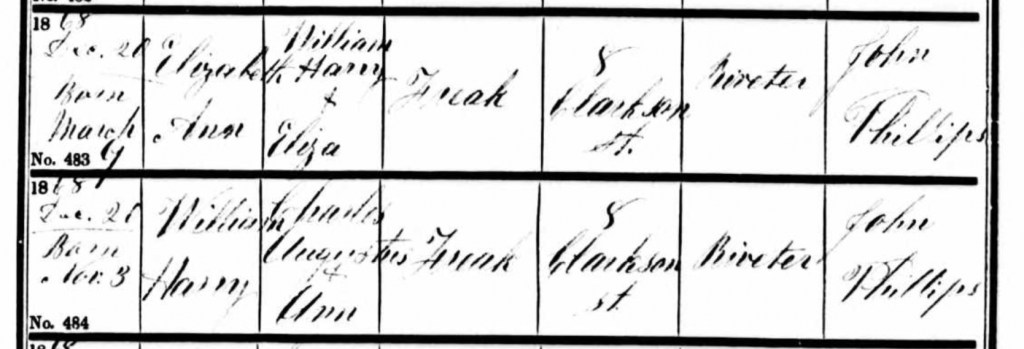 On a winters day, Sunday, the 20th day of December 1868, William and Eliza made their way from their home at Number 8, Clarkson Street, to St. Jude’s Church in Bethnal Green, Tower Hamlets, London, for the baptism of their daughter, Elizabeth Freak. The church, steeped in history, would have been filled with warmth and reverence as the couple brought their firstborn before the altar, marking a significant milestone in her young life. John Phillips, the officiating minister, performed the baptism and recorded in the Baptism Register that William was the son of Charles Augustus Freak, a detail that would have been a point of pride for William as he stood with his wife in the presence of their child’s spiritual journey. The family’s abode was listed as Number 8, Clarkson Street, reaffirming their place within the community. It was a special day for the Freak family, as William’s brother, Charles Augustus Freak, and his wife Ann also brought their son, William Harry Freak, to be baptised at the same church on the very same day. John Phillips performed the baptism for Charles and Ann’s son as well, recording in the Baptism Register that Charles Augustus Freak, a riveter, was also residing at Number 8, Clarkson Street. The shared experience of baptism for both families on that cold December day must have been a meaningful connection for William and Charles, a sign of family unity and a testament to their deep ties despite the challenges of their daily lives. The street they lived on and the church they attended had become central to their family’s life, their home base where memories were made and faith was nurtured.