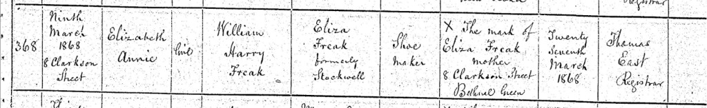 William and Eliza’s firstborn, a daughter named Elizabeth Annie Freak, arrived on Monday, the 9th day of March 1868, at their home at Number 8, Clarkson Street, Bethnal Green, Middlesex, England. The excitement of their growing family must have filled the small space of their home, as the couple welcomed their first child with love and joy. Eliza, proud and overwhelmed with her new role as a mother, registered her daughter’s birth on Friday the 27th day of March 1868. The registrar, Thomas East, carefully recorded in the birth register that Elizabeth Annie Freak, a girl, was the daughter of William Harry Freak, a shoemaker, and Eliza Freak, formerly Stockwell. Both parents were listed as residing at Number 8, Clarkson Street, Bethnal Green. Eliza, unable to sign her name, made her mark with an "X," a humble but poignant symbol of the life she led, working hard to care for her family while navigating the challenges of Victorian England. Elizabeth’s birth marked a new chapter for William and Eliza, a tender beginning in a world filled with both hope and hardship.