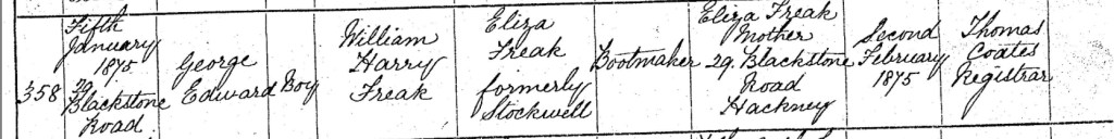 On Monday, the 5th day of January 1875, William and Eliza welcomed their newborn son into the world at their family home, Number 29, Blackstone Road, Hackney, Middlesex, England. They named him George Edward Freak, a name that carried both strength and tradition, ensuring his place within the ever-growing Freak family. Just under a month later, on Tuesday, the 2nd day of February 1875, Eliza made the journey to register George’s birth in Hackney. The registrar, Thomas Coates, carefully recorded the details in the official birth register, noting that George Edward Freak, a boy, was the son of William Harry Freak, a bootmaker, and Eliza Freak, formerly Stockwell, both of Number 29, Blackstone Road. With each new child, the Freak family’s story continued to unfold, woven together with moments of joy, resilience, and the daily struggles of working-class life in Victorian England. George's birth was another milestone, a testament to the enduring legacy of William and Eliza as they built a future for their growing family.