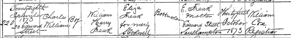 Amidst the lingering sorrow of their recent loss, William and Eliza found hope and joy once more as they welcomed a new life into their home. On Sunday, the 28th of September 1873, at Number 20, Edward Street, Southampton, Hampshire, England, their son was born, a child who would carry the names of both his father and grandfather. They named him Charles William Freak, a tribute to the memory of William’s late father, Charles Freak, and a continuation of his own name. For a family who had endured both love and loss in equal measure, Charles William’s arrival must have felt like a light in the darkness, a reminder that life moves forward even in the face of grief. Eliza, no stranger to the responsibilities of motherhood, would have cradled her newborn, finding comfort in his warmth and presence. On the 31st of October 1873, Eliza made the journey into Southampton to officially register her son’s birth. The registrar, William Cox, carefully recorded the details in the birth register: Charles William Freak, a boy, born on the 28th of September 1873 at Number 20, Edward Street. His parents were listed as William Harry Freak, a Bootmaker, and Eliza Freak, formerly Stockwell. As they settled into life with their newborn son, William and Eliza must have held onto the hope that Charles William would thrive, growing up strong and healthy in the ever-changing world around them.