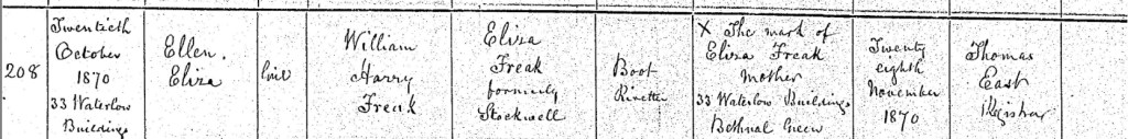 The autumn of 1870 brought both joy and responsibility to William and Eliza Freak as they welcomed their second daughter into the world. On Thursday, the 20th of October, in the modest surroundings of their family home at Number 33, Waterlow Buildings, Bethnal Green, London, Eliza gave birth to a beautiful baby girl, whom they named Ellen Eliza Freak. Her arrival would have been a moment of happiness, a precious new life in a household already filled with the energy of their two-year-old daughter, Elizabeth Annie. Life in Waterlow Buildings was likely busy and demanding, with William working as a boot riveter to provide for his growing family. The neighbourhood was a working-class community, bustling with families trying to make ends meet, and Eliza, like so many women of her time, carried the daily burden of keeping the home running while tending to her children. On Monday, the 28th of November, Eliza made the journey into Bethnal Green to register Ellen’s birth. With her infant daughter in tow, she stepped into the registrar’s office, where Thomas East carefully recorded the details in the birth register. Ellen Eliza Freak, a girl, born to William Harry Freak, a boot riveter, and Eliza Freak, formerly Stockwell, both residing at Number 33, Waterlow Buildings. When the time came to officially sign the document, Eliza, unable to write, marked her name with a simple X—an unassuming yet powerful reminder of the hardships many working-class women faced, their lives dictated by strength and resilience rather than literacy. Ellen’s birth marked another chapter in the life of the Freak family, a life shaped by love, struggle, and endurance in the heart of London’s East End.