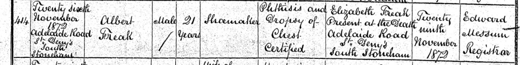 The chill of late November 1872 brought sorrow to the Freak family as William’s younger brother, Albert Freak, passed away at just 21 years of age. A young shoemaker in the prime of his life, Albert’s days were cut short on Tuesday, the 26th of November, at his home on Adelaide Road, St. Deny’s, South Stoneham, Southampton. His passing was not sudden but the result of a long illness, phthisis, known today as tuberculosis, and dropsy of the chest, a condition associated with severe fluid retention. These ailments were all too common in the 19th century, especially among working-class men whose environments often exposed them to poor air quality, long hours of labor, and inadequate medical care. At his side in those final moments was Elizabeth Freak, very likely his mother, who bore witness to yet another tragic loss in her family. It was she who carried the heavy burden of registering his death three days later, on Friday, the 29th of November. The registrar, Edward Messum, documented the details, recording the official cause of death as phthisis and dropsy of the chest, certified by a physician. Though mere words on paper, they told the story of a young life taken too soon, a mother’s grief, and the harsh realities of illness in Victorian England. Albert’s death marked another painful chapter for the Freak family. William, now settled in Bethnal Green with a family of his own, would have undoubtedly received word of his brother’s passing with a heavy heart. Though miles separated them, the bonds of family and shared childhood memories could not be erased. As the year drew to a close, the loss of Albert served as a stark reminder of the fragility of life. The Freak family had known hardship, but they had also known endurance. Even in mourning, life had to go on, as it always did for those struggling to carve out an existence in the working-class communities of 19th-century England.