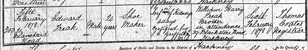 William’s brother, 24-year-old shoemaker Edward Freak, sadly passed away at Number 21, Blackstone Road, Hackney, Middlesex, England, on Tuesday, the 5th day of February, 1878. In his final moments, he was not alone, his brother, William Harry Freak, of Number 29, Blackstone Road, was by his side as he drew his last breath. The bond of brotherhood, forged through years of shared joys and hardships, now carried William through the painful duty of registering Edward’s death the following day, Wednesday, the 6th day of February, 1878, in Hackney. The registrar, Thomas Coates, solemnly recorded in the death register that Edward had passed from what was listed as "Inf of Kidneys, 4 days," certified by S. C. Griffith, Medical Director. The term "Inf" likely stood for an infection or inflammation of the kidneys, a cruel affliction that took him too soon. William, no doubt grieving yet steadfast, ensured his brother’s passing was properly documented, his name etched into history, forever a part of the Freak family’s story.