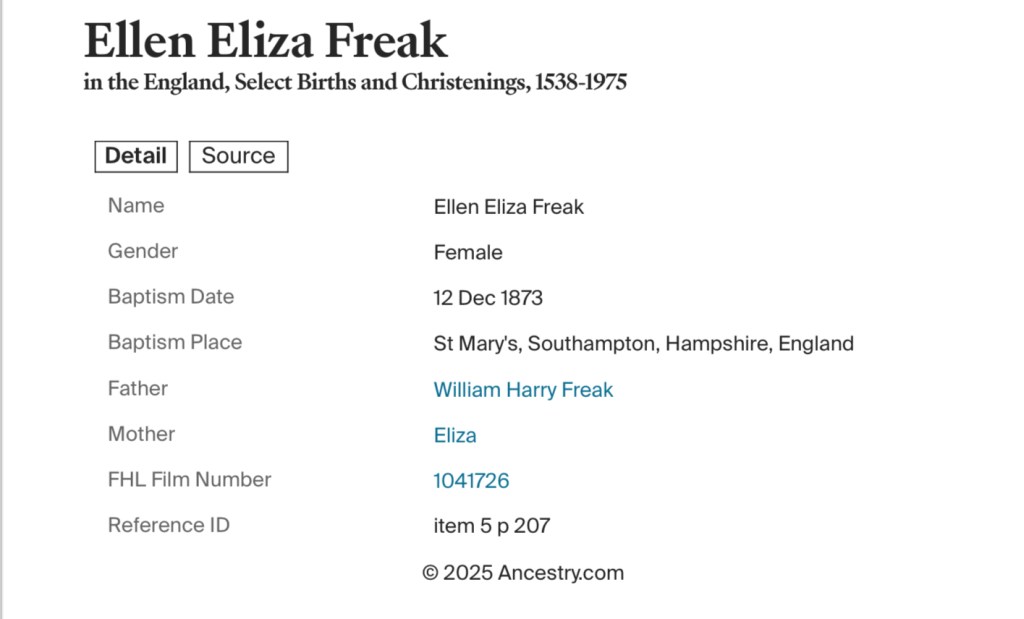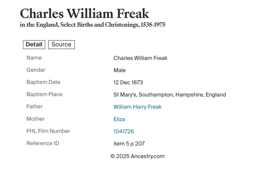 On Friday, the 12th day of December 1873, William and Eliza took their young children, Ellen Eliza and Charles William Freak, to be baptised at St Mary’s Church, St Mary’s, Southampton, Hampshire, England. The church, standing as a symbol of faith and tradition, had already witnessed many significant moments for the Freak family, and this day was no exception. Baptism was not only a religious rite but also a cherished milestone, signifying a child’s official welcome into both the faith and the community. As William and Eliza stood before the altar, they must have felt a mixture of pride and hope for their children’s futures. Ellen Eliza, just three years old, may have clung to her mother’s hand, watching as her baby brother received the sacred blessing alongside her. Though ancestry records confirm the details of their baptism, no official documents from the baptism register are available. It is a reminder that not all pieces of history remain intact, yet the significance of these moments endures through family stories and the records that do exist. For William and Eliza, this was a day of faith and family, a step forward in the lives of their beloved children.