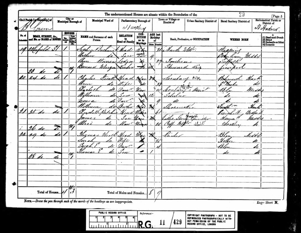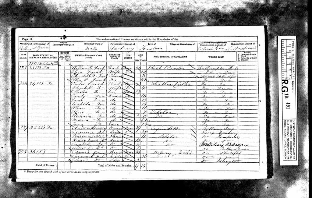 As the sun set on Sunday, the 2nd day of April, 1871, the Freak family settled in for the evening at their home, Number 33, Waterlow Buildings, Bethnal Green, Middlesex. The day had been much like any other, William was most likely returning from his long hours as a boot riveter, Eliza tending to their two young daughters, Elizabeth Annie, now three years old, and little Ellen Eliza, just five months old. Their modest home in the heart of London’s East End was filled with the sounds of family life, of children’s laughter and the quiet hum of daily survival. That night was significant in a way they may not have even considered at the time, it was census night, a moment when their existence was officially documented, their names and occupations recorded for posterity. A census taker, moving door to door, would have collected their details, noting William’s trade as a boot riveter, a skill that kept food on the table and a roof over their heads but one that required long hours and steady hands. Waterlow Buildings, like much of Bethnal Green, was home to working-class families, many of whom, like the Freaks, lived in small, crowded spaces where hard work was a necessity, not a choice. The streets outside bustled with life, with vendors calling out their wares and the smell of coal smoke thick in the evening air. Though life was challenging, there was also resilience, people making do, finding joy where they could, and pushing forward, no matter what the future held. For William and Eliza, this census captured just a moment in time, a young family at the start of their journey together. What lay ahead, the joys, the hardships, and the trials, remained unknown. But for now, on this evening in 1871, they were simply together, a family, building their life one day at a time.