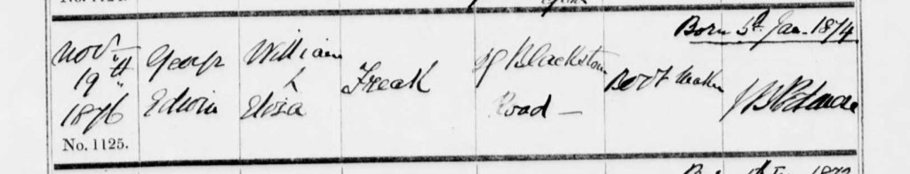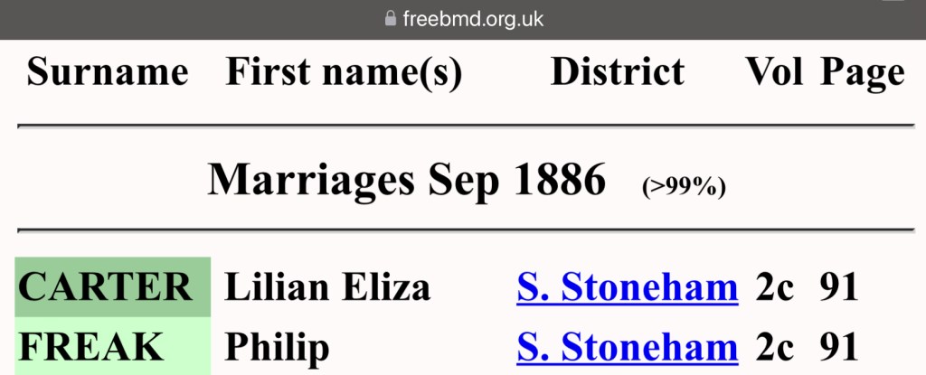In the late summer of 1886, William’s younger brother, Philip Freak, stood before family and friends to exchange vows with Lilian Eliza Carter. Their marriage took place in the South Stoneham district of Hampshire, England, marking the beginning of a new chapter in their lives together. With so many significant events to document in William’s life story, the cost of acquiring every official certificate has become an unfortunate limitation. While I have had to make the difficult decision to forego purchasing Philip and Lilian’s marriage certificate, those who wish to obtain it can do so using the following GRO reference: