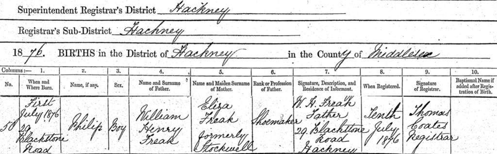 On Saturday, the 1st day of July 1876, William Harry Freak and Eliza Freak (née Stockwell) welcomed their son, Philip Freak, into the world at their home at Number 29, Blackstone Road, Hackney, Middlesex, England. It was another joyful occasion for the couple as their family continued to grow. Just over a week later, on Monday, the 10th day of July 1876, William traveled to Hackney to register Philip's birth. The registrar, Thomas Coates, was in attendance and recorded in the official birth register that Philip Freak, a boy, was the son of William Harry Freak, a shoemaker, and Eliza Freak, formerly Stockwell, both of Number 29, Blackstone Road, Hackney. The birth of Philip added yet another chapter to the family's story, reflecting the everyday life of a working-class family in Victorian England. As the family expanded, the love and care they offered their children remained constant, even as their lives continued to unfold amid the challenges of the era.