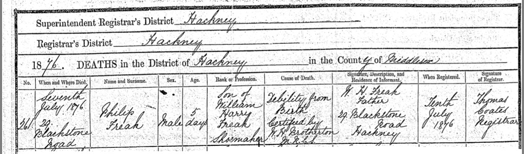 On Friday, the 7th day of July 1876, just five days after his birth, William and Eliza’s son, Philip Freak, sadly passed away at their home, Number 29, Blackstone Road, Hackney, Middlesex, England. The cause of death was recorded as "Debility from birth," a term often used during that time to describe the fragile health of newborns, sometimes linked to complications from birth. His death was certified by W.H. Brotherson, M.R.C.S. In the wake of this heart-wrenching loss, William Harry Freak, a shoemaker, took on the sorrowful task of registering his son’s death. On Monday, the 10th day of July 1876, William made his way to register the death, and Thomas Coates was the registrar in attendance. Philip’s brief life marked a tragic chapter in the Freak family’s history, reflecting the hardships many families faced during the Victorian era, especially the challenges associated with infant mortality. The grief of losing a child so young would have weighed heavily on the couple, yet their resilience in the face of such sorrow would continue to shape their lives as they moved forward.
