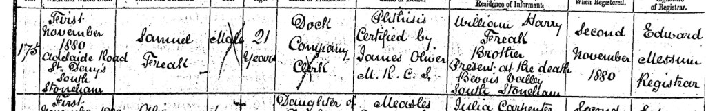The crisp autumn air hung heavy with sorrow on Monday, the 1st day of November 1880, as William Harry Freak sat by his younger brother Samuel’s bedside in Adelaide Road, St. Deny’s, South Stoneham. Samuel, just 21 years old, had fought a long and losing battle against phthisis, a cruel disease that slowly drained the life from his body. As the flickering light of the oil lamp cast long shadows across the room, Samuel took his final breath, leaving behind a brother who had already known too much loss. With a heavy heart, William took on the solemn duty of registering Samuel’s death the very next day, Tuesday, the 2nd of November. At the registrar’s office, Edward Messum recorded the details in the death register, noting that Samuel, a Dock Company Clerk, had succumbed to phthisis, with the diagnosis certified by James Oliver M.R.C.S. The words on the page, so final and unfeeling, could never capture the depth of grief William must have felt as he left the office, carrying yet another weight upon his shoulders. As of now, Samuel’s final resting place remains unknown. What is certain, however, is that he was not laid to rest in the Old Cemetery of Southampton. Somewhere, beneath the same skies he once walked beneath, Samuel’s body lies in eternal sleep, his presence now only a cherished memory in the hearts of those who loved him.