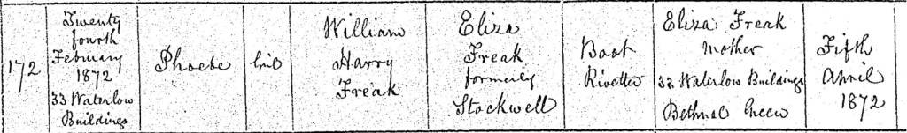 On a winters day, Saturday, the 24th of February, 1872, the Freak family welcomed another precious addition to their growing household. Within the walls of their home at Number 33, Waterlow Buildings, Bethnal Green, Eliza brought their third daughter, Phoebe Freak, into the world. The cramped but familiar surroundings of their modest dwelling bore witness to another chapter in their lives, another tiny heartbeat joining the steady rhythm of their family. By now, William and Eliza had settled into the rhythms of parenthood. Their eldest daughter, Elizabeth Annie, was four years old, full of curiosity and perhaps eager to help with her new baby sister. Little Ellen Eliza, barely seventeen months old, would have still been a babe in arms herself, unaware that she was no longer the youngest. Life in Waterlow Buildings was not easy, the East End of London was a place of struggle for working-class families, where labor was relentless, and homes were often crowded. But within their home, love and resilience carried them through. Eliza made the journey to officially register Phoebe’s birth on Friday, the 5th of April, 1872. As she stood before Thomas East, the registrar, she gave the details of her newborn daughter. He recorded them in the birth register, Phoebe Freak, a girl, born on the 24th of February, daughter of William Harry Freak, a boot riveter, and Eliza Freak, formerly Stockwell, both of Number 33, Waterlow Buildings. With her usual mark, an X, Eliza confirmed her daughter’s place in history, a simple stroke of ink securing her existence in the world. Though their lives were shaped by hardship, moments like these, the birth of a child, the growth of their family, were reminders of hope, of the future unfolding before them. Phoebe’s arrival was not just another name in the register, but another thread woven into the fabric of their story, a testament to the enduring strength of the Freak family.