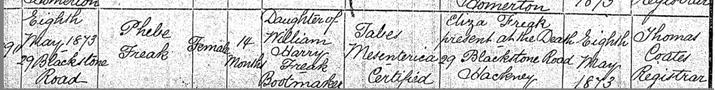 The Freak family was once again met with heartbreak when, on Thursday, the 8th of May 1873, little Phoebe Freak took her final breath at just 18 months old. Their home at Number 29, Black Stone Road, Hackney, Middlesex, England, became the setting of unimaginable sorrow as Eliza, her mother, held her in her final moments. The tiny child, so full of promise, was taken by Tabes Mesenterica, a cruel disease that claimed the young and vulnerable, leaving behind grieving parents and an empty cradle. With the weight of loss heavy on her shoulders, Eliza gathered herself and carried out the painful duty of registering Phoebe’s death on the same day. The registrar, Thomas Coate, carefully recorded the details, noting that the little girl was the daughter of William Harry Freak, a bootmaker. Her death, another blow to a family that had already known so much loss, would have shaken the very foundations of their home. For William and Eliza, the quiet that followed must have been deafening. No more soft coos or playful giggles, no more tiny hands reaching out for comfort. Just absence. As the days passed, the family would have found what little solace they could in one another, holding on tightly to the children they still had, even as their hearts remained shattered by the one they had lost.