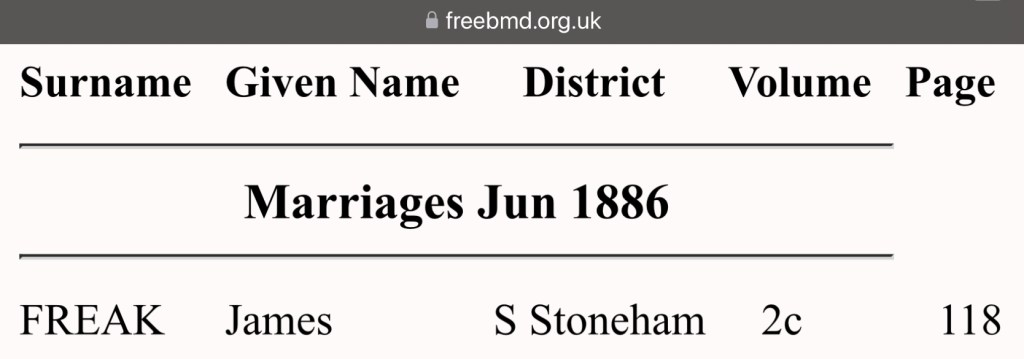 **Marriages June 1886, Freak, James, Frampton, Ada Annie, South Stoneham, Volume 2c, Page 118.**