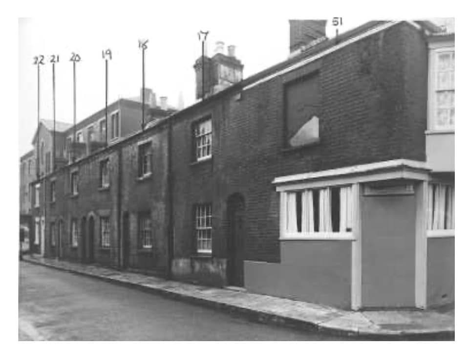 Blackstone Road is situated in the London Borough of Hackney, within the historic county of Middlesex. The area surrounding Blackstone Road has undergone significant transformations over the centuries. In the 16th century, Hackney was a collection of small villages surrounded by meadows, attracting the Tudor elite who built grand houses and hunting lodges in the area. By the 19th century, Hackney experienced substantial urban development, with residential streets like Blackstone Road emerging to accommodate the growing population. Photographs from circa 1964 provide a glimpse into the residential character of Blackstone Road during that period, showing the rear view of houses on the south side, taken from 13 Blanchard Road looking northeast.