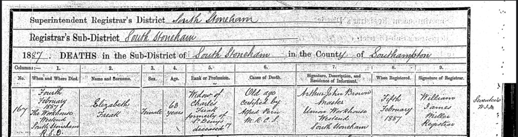 William’s beloved mother, Elizabeth Freak (née Bush), a widow of Charles Freak and formerly of St. Deny’s, took her final breath on Friday, the 4th of February 1887. She was just 63 years old when she passed away within the cold and unforgiving walls of The Workhouse, West End, South Stoneham, Southampton, Hampshire, England. The news of her passing was officially recorded by William James Miller, the registrar, on Wednesday, the 9th of February 1887, in the South Stoneham death register. A stranger, Arthur John Brown, the Master of the Union Workhouse, was the one to report her death, a heartbreaking reminder that in her final moments, no loved ones were there to hold her hand or offer her comfort. Elizabeth had died from old age, as certified by Alfred Pern, a Member of the Royal Colleges of Surgeons. The thought of her last days spent in the confines of the workhouse, instead of surrounded by the family she had raised and loved, is almost too painful to bear. The weight of her absence must have been a heavy burden on William’s heart, a sorrow that no words or time could ever truly heal. Unfortunately, the final resting place of Elizabeth and her husband Charles, remains a mystery, a missing piece in the story of their lives. Despite my efforts, I have yet to locate where they were laid to rest. What I do know, however, is that they were not buried in Southampton Old Cemetery. The uncertainty of their burial site only deepens the sorrow, leaving unanswered questions. Wherever they may be, I can only hope they found peace, reunited in eternity beyond the hardships they endured in life.