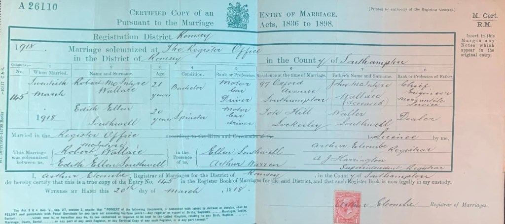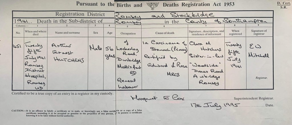 Arthur’s death was recorded as being caused by carcinoma of the stomach, a cruel and painful illness that slowly took him from her. His sister-in-law, Clara M. Hutchens, of Woodside, Danes Road, Awbridge, Romsey, bore the difficult task of registering his passing on the very same day. The registrar, E. W. Mitchell, entered the details into the death registry, with certification provided by Edward L. Rose, a Member of the Royal Colleges of Surgeons.