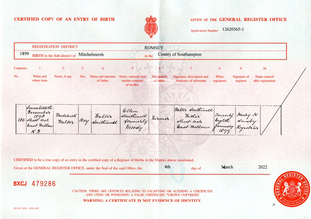 On a winter’s day, Saturday, the 17th day of December, 1898, in the quiet hamlet of Shootash, East Wellow, Ellen Southwell gave birth to her fifth child, a son named Frederick Walter Southwell. The December air would have carried the scent of damp earth and woodsmoke, as fires burned steadily in hearths to keep the winter chill at bay. Within the Southwell home, nestled among the rolling Hampshire countryside, the family welcomed another child into their growing household.