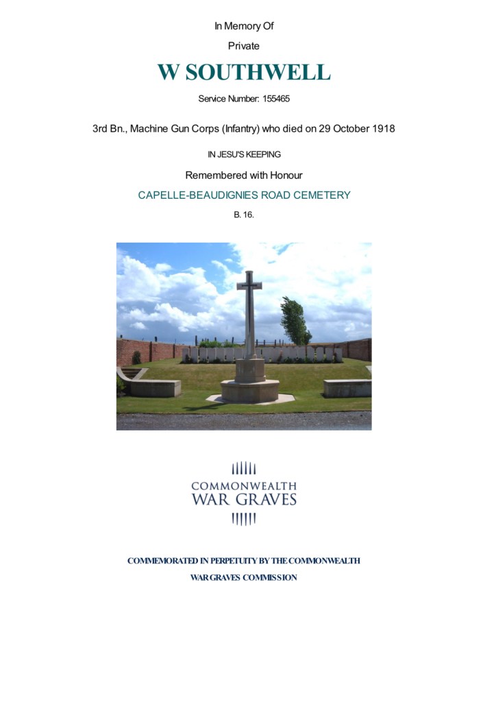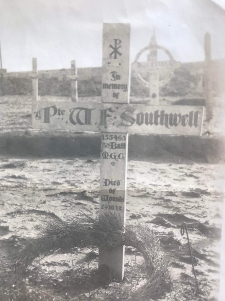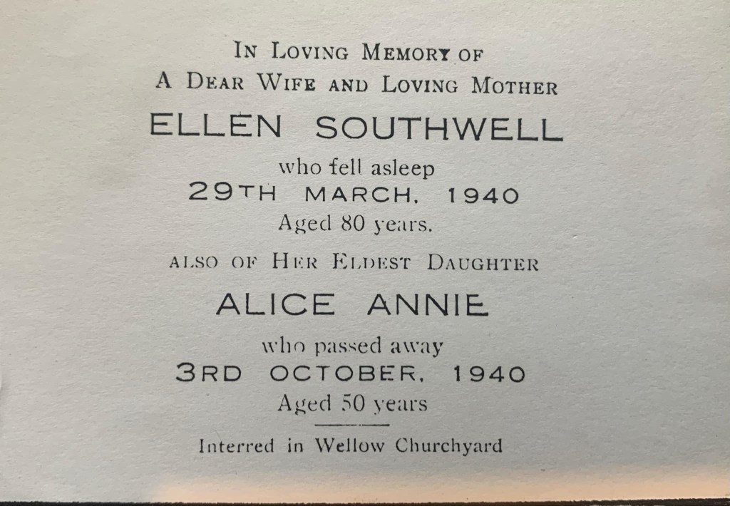 The funeral service was conducted by the Vicar (the Rev. T. Plant), and the immediate mourners were Mrs. J. Moore (daughter), Mr. G. South-well (son), Mrs. E. Wallace (daughter), Mr. and Mrs. P. East (daughter and son-in-law), Mrs. G. Webb and Mrs. H. Moody (sisters-in-law), grandchildren Ronnie, Jack, Fred, Godfrey, and Mr and Mrs. H. Boyes, Mrs. C. White, Mrs. G. Barnes, Miss M. Moody and Mrs. P. Holt (nicees), Mr. and Mrs. G. Hedges (nephew and niece), Willie (great-nephew), Mrs. W. Hayter, Mrs. M. Moody, Miss R. Moody and Mrs. W. Moody (cousins). Other mourners included Mrs. B. East, Mrs. Loader, and Mr. and Miss Collins. Owing to illness, Mr. Walter Southwell (husband) and Mr. and Mrs. A. Hutchens (son-in-law and daughter) were unable to attend. Beautiful floral tributes were received : In loving memory.