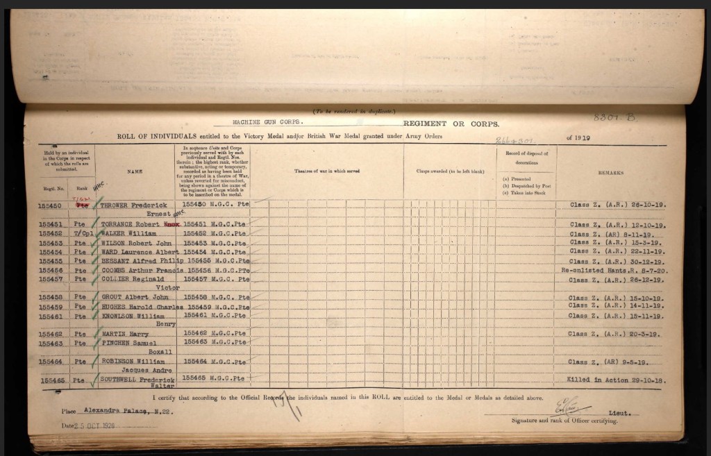 It is difficult to say for certain whether the Southwell family traveled to any formal ceremony to receive the medal or if they were even involved in any official commemoration. In many cases, medals like the Victory Medal were either sent by post or presented in a smaller, more intimate setting, especially in the aftermath of the war. Whether or not Emily or her family attended a public ceremony, the emotional weight of Frederick's award would have been deeply felt, though likely with a mixture of pride and sorrow. His medal would have been a symbol of the tremendous price he paid and the grief that lingered within the family, compounded by the unresolved feelings surrounding Emily’s own position within the family at the time.