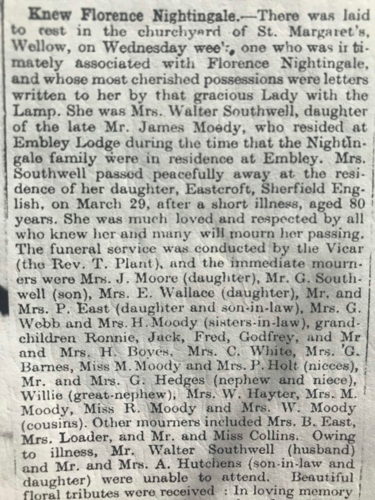 There was laid to rest in the churchyard of St. Margaret's, Wellow, on Wednesday week, one who was intimately associated with Florence Nightingale, and whose most cherished possessions were letters written to her by that gracious Lady with the Lamp. She was Mrs. Walter Southwell, daughter of the late Mr. James Moody, who resided at Embley Lodge during the time that the Nightingale family were in residence at Embley. Mrs. Southwell passed peacefully away at the residence of her daughter, Eastcroft, Sherfield English, on March 29, after a short illness, aged 80 years. She was much loved and respected by all who knew her and many will mourn her passing.