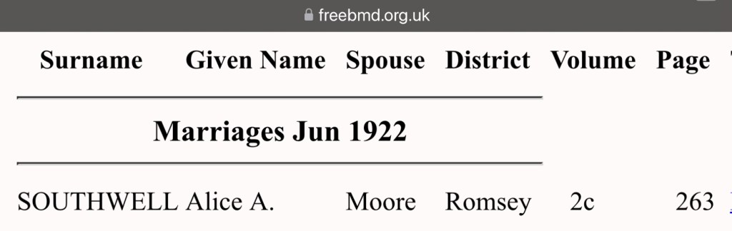 GRO Reference - Marriages, Jun 1922, Southwell, Alice A, Moore, Jeremiah, Romsey, Volume 2c, Page 263.
