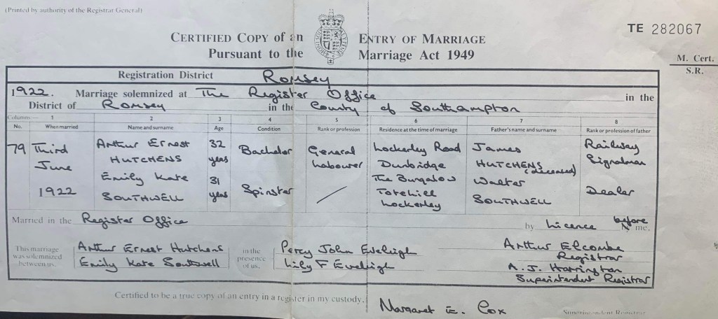 On Saturday, the 3rd day of June, 1922, 31-year-old Emily Kate Southwell, a spinster residing at The Bungalows, Totehill, Lockerley, Hampshire, England, married 32-year-old bachelor, Arthur Ernest Hutchens, a general labourer from Lockerley Road, Dunbridge, Hampshire, England. The ceremony took place at The Register Office in Romsey, Hampshire, where Emily and Arthur were united in marriage by Arthur Elcombe, the registrar, and A.J. Harrington, the Superintendent Registrar.