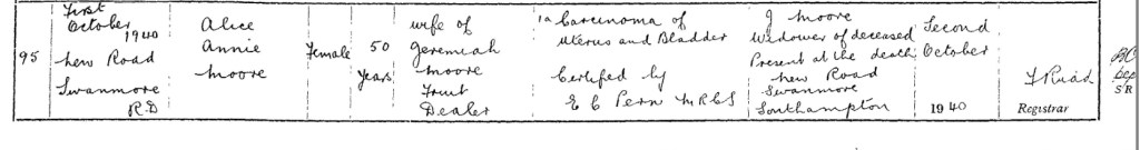 Emily’s sister, Alice Annie Moore (née Southwell), passed away at the age of 50 on Tuesday, the 1st of October 1940, at her home on New Road, Swanmore, Southampton. A devoted wife and mother, Alice had shared her life with her husband, Jeremiah Moore, a fruit dealer, and together they had brought ten children into the world. Jeremiah was by her side in her final moments and, with a heavy heart, registered her passing the following day. Her death, caused by carcinoma of the uterus and bladder, was certified by E. C. Pern, MRCS, and recorded by registrar F. Rual.