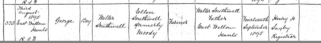 A month after George’s birth, on Wednesday, the 4th day of September, Walter made the familiar journey to Romsey to officially register his son’s arrival. The registrar, Henry H. Saxby, recorded the details carefully, George Southwell, a boy, born to Walter and Ellen in East Wellow. These moments of official record-keeping, though routine, were significant milestones in a child’s life. They placed the new generation firmly within the history of the parish, ensuring that George’s name would be carried forward in both family memory and formal documentation.