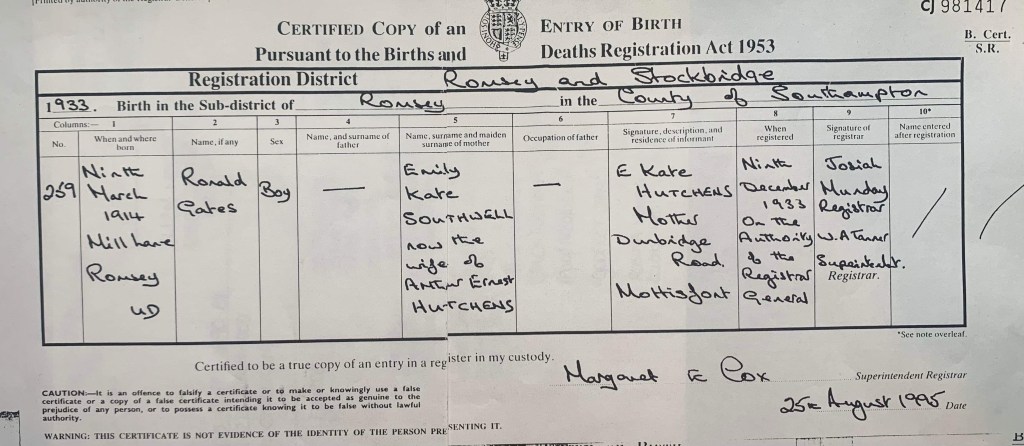 Emily’s son, Ronald Gates Southwell, known affectionately as Ronnie, was born on Monday, the 9th day of March, 1914, at Mill Lane, Romsey, Hampshire. His mother, Emily Kate Southwell, welcomed him into the world under circumstances that remain somewhat shrouded in mystery, as no father’s name was recorded at the time of his birth.