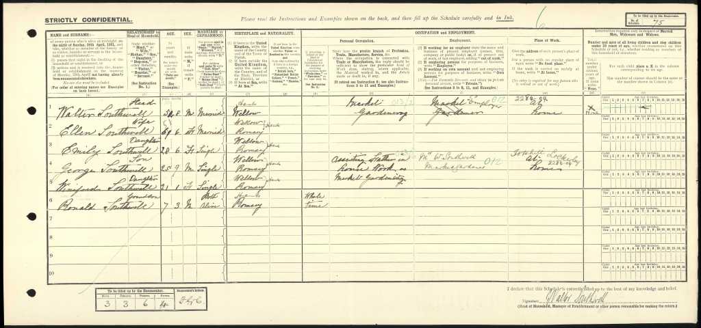 On Sunday, the 19th day of June, 1921, Emily Southwell, now a 28-year-old single woman, resided in the village of Lockerley, Hampshire, England, at the address of Totehill, Lockerley, Romsey. At this time, she was living with her parents, Walter and Ellen Southwell, along with her younger siblings and her son, Ronald. Walter, now 54, and Ellen, aged 51, were part of this family household, alongside Emily’s 21-year-old sister, Winifred, and her 25-year-old brother, George. Ronald, Emily’s 7-year-old son, also lived with the family, adding an extra layer to the household dynamics.