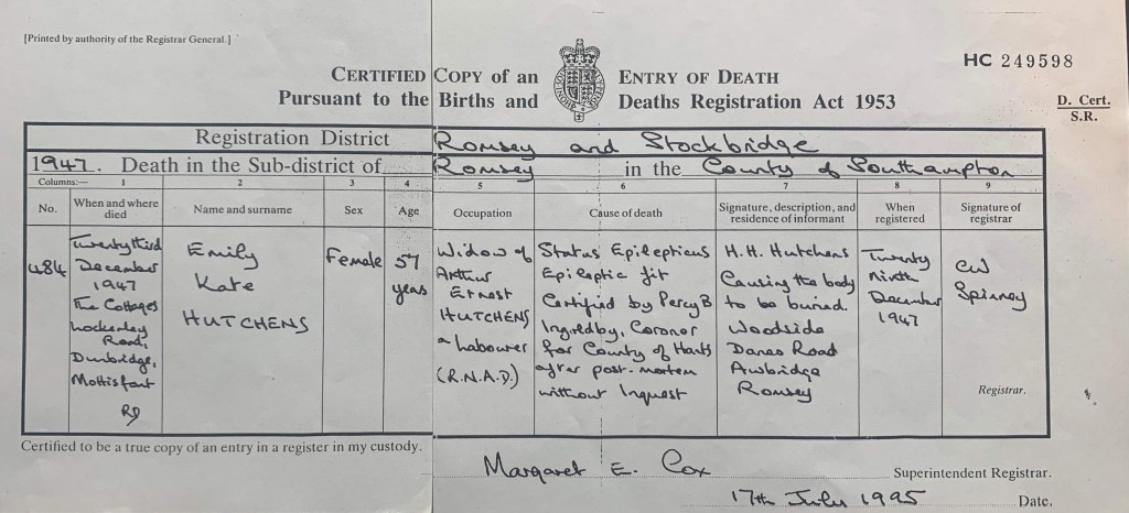 Her death was registered by her brother-in-law, Harford Harold Hutchens, at The Registry House, Number 36, Church Street, Romsey, Hampshire (Now renumbered 34 after infill) on the 29th of December, a few days after her passing.