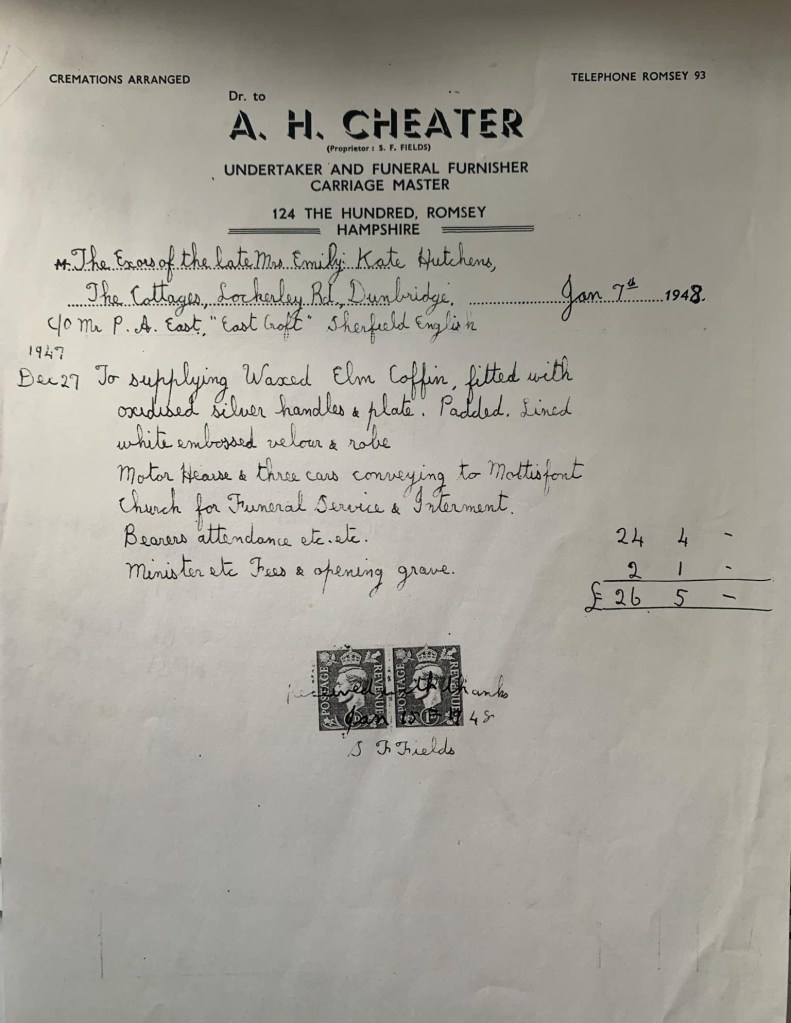 On Wednesday, 7th January 1948, A. H. Cheater, the undertaker and funeral furnished carriage master based at 124 The Hundred, Romsey, Hampshire, sent an invoice to Mr. Percy Alexander East, who was Emily Kate Hutchens’ brother-in-law and the husband of her sister Winifred. The bill, which detailed the funeral arrangements for Emily, was as follows: