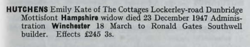 "HUTCHENS Emily Kate of The Cottages, Lockerley-road, Dunbridge, Mottisfont, Hampshire, widow, died 23 December 1947. Administration granted in Winchester on 18 March to Ronald Gates Southwell, builder. Effects £245 3s."
