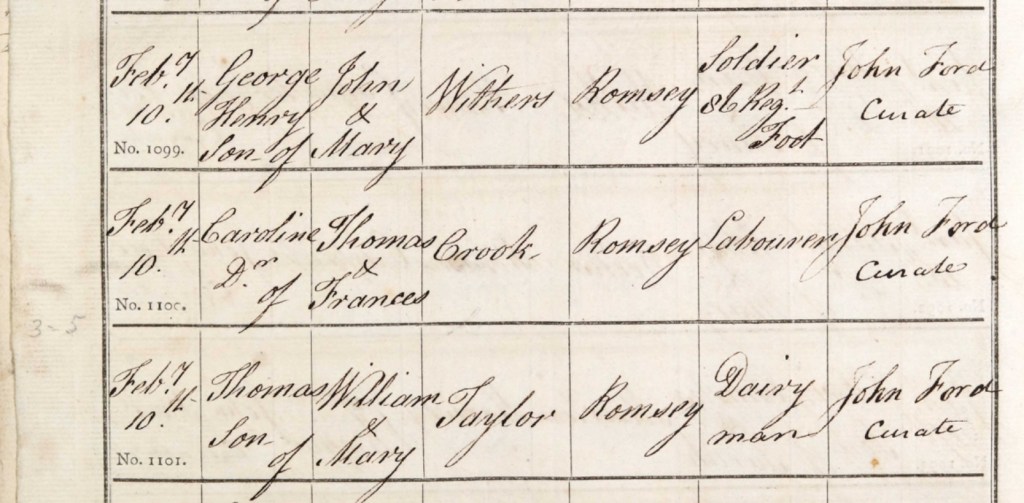 In early 1822, John and Mary Withers welcomed their second known child, a son named George Henry Withers, into the world. He was born in Romsey, Hampshire, just as his father had been before him, and though no official birth record exists due to the absence of civil registration at the time, his baptism gives us a window into this important chapter of their lives. George was baptised on Sunday, the 10th day of February 1822, at Romsey Abbey, a place steeped in centuries of faith and tradition. The ceremony was conducted by Curate John Ford, a dedicated clergyman who served at Romsey Abbey from the 7th of January 1814 to the 7th of August 1829. He was not only responsible for Romsey, but also for Chilworth and Timsbury, earning a salary of £90 and living locally in Romsey. His name appears time and again in the parish registers, carefully noting the milestones of those who passed through his church. That Sunday, George was not alone in being welcomed into the Church. Two other children, Caroline Crook and Thomas Taylor, were also baptised in the same service. Yet it is George’s entry that stands out for its quiet significance. Curate Ford recorded him as the son of, John Withers, a Foot Soldier in the 86 Regiment, and Mary Withers of Romsey. That single line tells us so much. John, no longer simply a labourer, was now serving as a foot soldier in the 86th Regiment, which opens an entirely new dimension to his life and story. It tells us that, at some point, John took up arms, perhaps out of duty, perhaps out of necessity, to support his growing family. It paints a picture of a man balancing service to country with devotion to home. George’s baptism stands as a testament not only to his arrival, but to his parents’ evolving life, a life touched by love, faith, and the challenges of the times. It roots him firmly in Romsey, beneath the vaulted ceilings of the Abbey where his name was spoken aloud and written down, ensuring he, too, would be remembered.