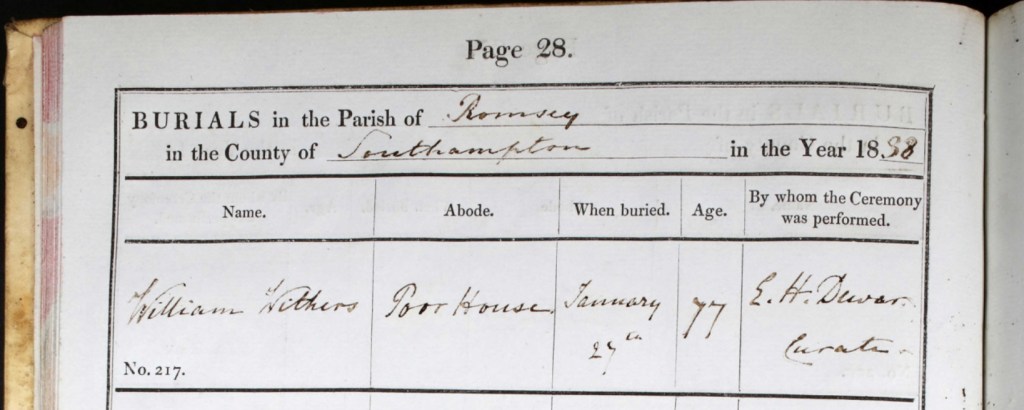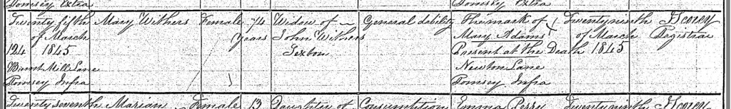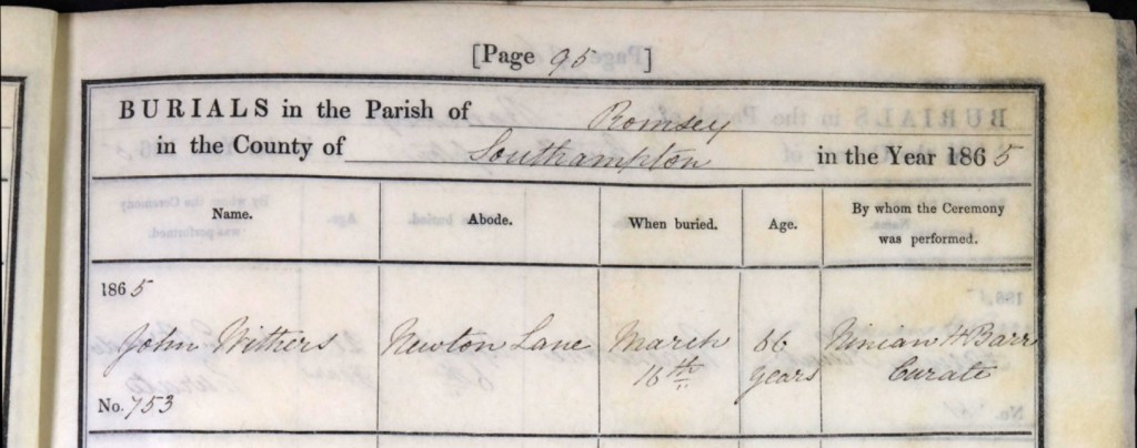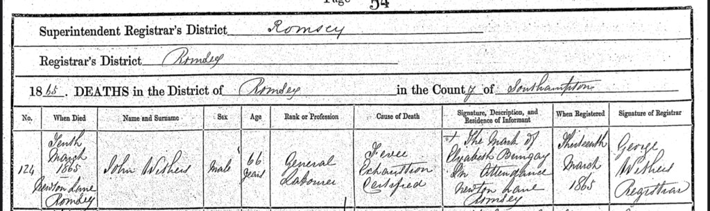 John’s mother, Mary Withers, formerly Grant, sadly passed away on Tuesday the 25th day of March 1845. Mary Adams of Newton Lane, Romsey, was present at her passing and took the responsibility of registering her death just a few days later, on Saturday the 29th day of March 1845. J Scorey, the registrar, recorded the details in the death register. He documented that 74-year-old Mary Withers, wife of John Withers, a Sexton, had died from general debility. There is a puzzling note to this entry. Mary’s husband was recorded as John Withers, not William, which raises questions we are unlikely ever to fully answer. Perhaps William had John as a middle name, or Mary Adams, under stress and grief, mistakenly gave the wrong name to the registrar. It is even possible that William was known informally as John in some circles. Whatever the reason, it remains one of those small but poignant mysteries that so often appear in the traces of lives long past.