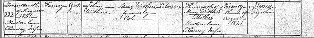 John and Mary’s daughter, Fanny Withers, was born on Tuesday the 17th of August 1841 at Newton Lane, Romsey, Hampshire, England. Just a few days later, on the 23rd of August 1841, her mother Mary went to register the birth in Romsey. The registrar, J Scorey, recorded in the birth register that Fanny Withers, a girl, was the daughter of John Withers, a labourer, and Mary Withers, formerly Cole, of Newton Lane, Romsey Infra. Mary, like her husband John had done before her, signed the official document with her mark, a simple yet powerful X, a silent testament to her place in the family’s continuing story.