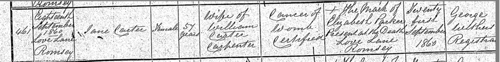 John’s sister, Jane Carter nee Withers, passed away on Tuesday, the 18th day of September, 1860, at Love Lane, Romsey, Hampshire, England. Elizabeth Parker, of Love Lane, Romsey, was present with Jane when she died and took the responsibility of registering Jane’s death on Friday, the 21st day of September, 1860. The registrar, George Withers, recorded Jane's details in the death register. He noted that 57-year-old Jane Carter, wife of William Carter, a carpenter, died from cancer of the womb, and that her death had been certified. Jane’s passing marked another moment of sorrow for the Withers family, a reminder of the toll time and illness can take. Her death, certified by the attending physician, brought an official end to her battle with illness, and her life was forever memorialized in the official records of Romsey.