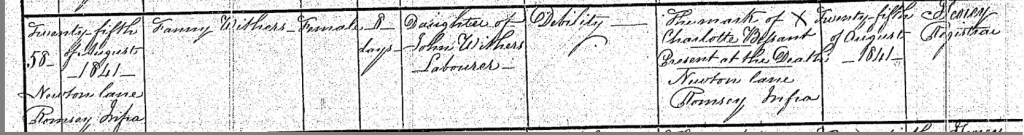 John and Mary’s joy at welcoming their daughter Fanny was heartbreakingly short-lived. Just eight days after her birth, little Fanny Withers sadly passed away on Wednesday the 25th day of August 1841 at Newton Lane, Romsey, Hampshire, England. Charlotte Bessant, a resident of Newton Lane who had been present at Fanny’s death, registered her passing later that same day. The registrar, whose name is unclear on the record, entered into the death register that Fanny Withers, only eight days old and the daughter of John Withers, a labourer, had died of debility. Charlotte, like Mary before her, signed the official document with her mark, a simple X, a quiet symbol of grief shared by those who had cared for the little one in her short life.
