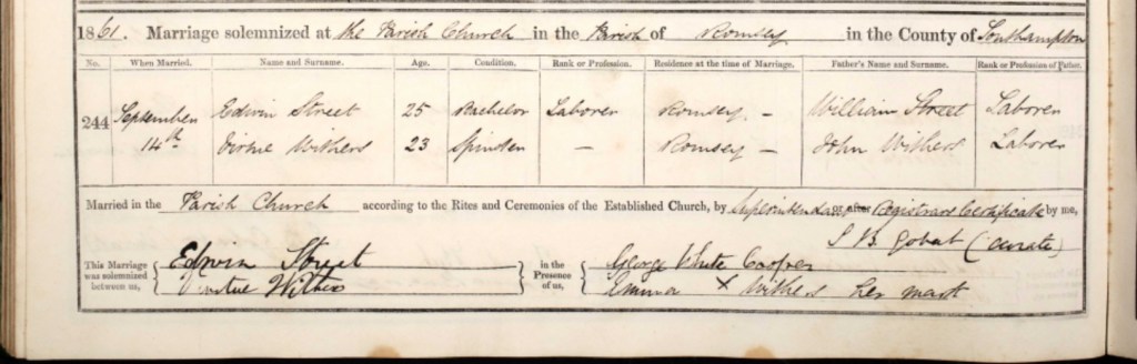 John and Mary’s daughter, Virtue Anna Withers, married 25-year-old bachelor Edwin Street on Saturday, the 14th day of September, 1861, at Romsey Abbey, Romsey, Hampshire, England. The ceremony was performed by Curate S. B. Pobat, who recorded their details in the marriage register. According to the entry, 23-year-old spinster Virtue Withers, from Romsey, was the daughter of John Withers, a labourer, while 25-year-old bachelor Edwin Street, a labourer also from Romsey, was the son of William Street, a labourer. Their witnesses were George Copper and Emma Withers. Interestingly, Emma, Virtue’s sister, signed the official document with her mark, an “X,” indicating that she may not have been able to write her name. This union marked a new chapter for Virtue as she began her life with Edwin Street, creating a future in Romsey with her new family.