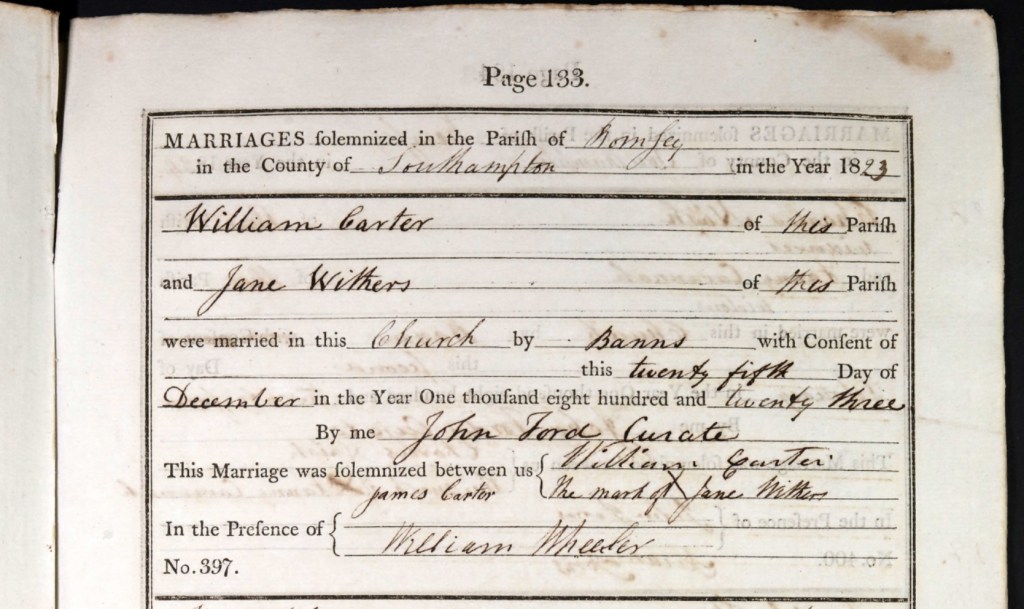 On Christmas Day, Thursday the 25th day of December 1823, John’s sister, Jane stood beneath the stone arches of Romsey Abbey and married William Carter. It was a day already sacred in the Christian calendar, but for Jane and William, it would forever be remembered as the day they began their life together as husband and wife. Both were of the parish of Romsey, and they chose to marry in the heart of their community, in the same church where Jane had been baptised nearly two decades earlier. The ceremony was performed by Curate John Ford, whose familiar hand had already recorded so many moments in the lives of the Withers family. Jane, like her brother John before her, signed the marriage document with her mark, an ‘X’, a humble yet powerful symbol of commitment in an age when literacy was not guaranteed, especially for women. Standing with them as witnesses were James Carter, likely a relative of William’s, and William Wheeler, men who stood in quiet support as vows were spoken and a future was sealed. A Christmas wedding in 1823 would have carried a warmth and symbolism all its own, uniting hearts in a season of peace, hope, and new beginnings. For Jane, it marked the start of a new chapter, not only in her own story, but in the continuing story of the Withers family, rooted always in Romsey, stitched together by love, resilience, and faith.