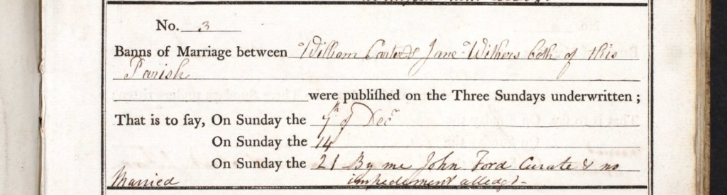 In December of 1823, the Withers family prepared to witness another important moment in their shared history, this time for Jane Withers, John’s younger sister. Jane, of the parish of Romsey, had fallen in love with William Carter, also of Romsey, and together they took the traditional step of having their marriage banns read aloud in church. The banns were called on three consecutive Sundays: the 7th, 14th, and 21st of December 1823, within the walls of Romsey Abbey, the same ancient and beloved place where Jane herself had been baptised years earlier. The services were led by Curate John Ford, a familiar figure by now, who faithfully documented each reading in the parish register. Ford had long been a steady hand at Romsey Abbey, and his careful stewardship of the records has given us this window into Jane's life. There were no impediments alleged. No one stood up to object, and no shadow was cast over their union. It was a quiet, respectful affirmation of a bond formed between two people ready to begin their lives together. Though we only have the banns at this point in the story, these simple announcements speak volumes. They tell us Jane had found a partner in William Carter. They tell us she remained close to home, to her roots in Romsey. And they remind us that behind every name written in a record book is a story of love, hope, and the ordinary but profound steps that build a family.