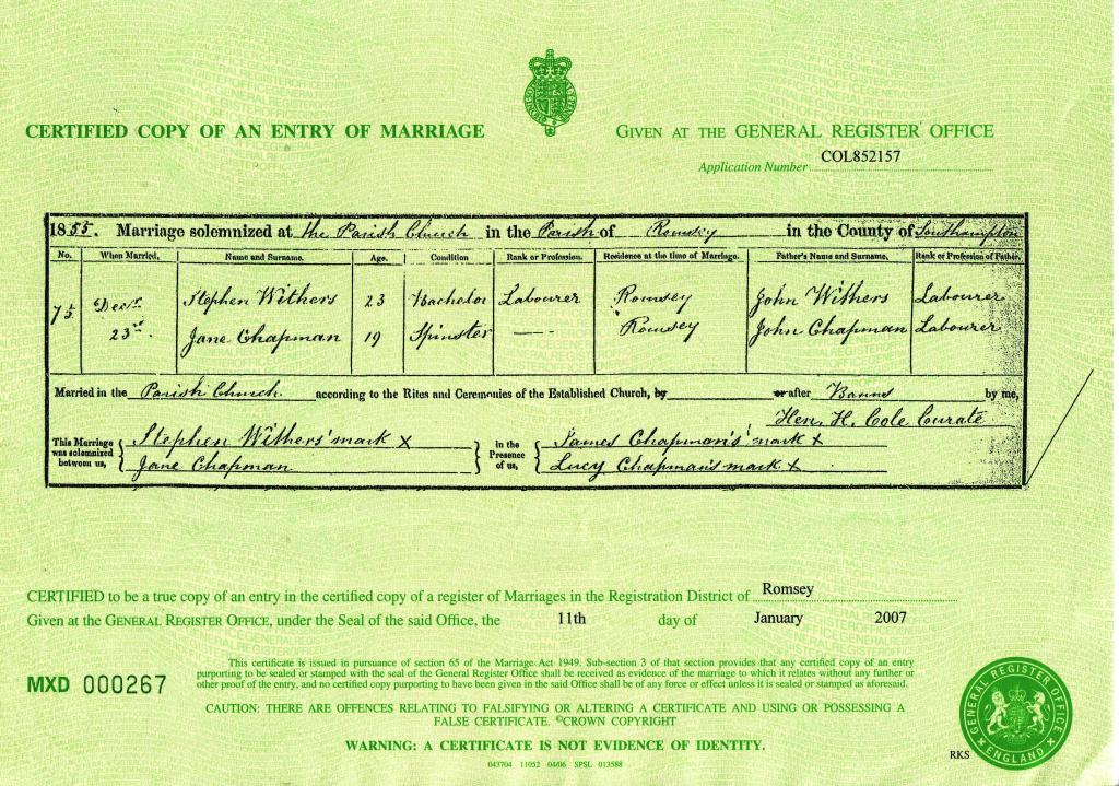John and Mary’s son, Stephen Withers, my 3rd Great-Grandfather, a 23-year-old bachelor and labourer of Romsey, married 19-year-old spinster Jane Chapman, also of Romsey, on Sunday, the 23rd of December, 1855, at Romsey Abbey, the Parish Church of Romsey, Hampshire, England. The marriage ceremony was performed by Curate Henry H. Cole, who meticulously recorded their details in the marriage register. He noted that Stephen was the son of John Withers, a labourer, and that Jane was the daughter of John Chapman, also a labourer. The couple was surrounded by witnesses James and Lucy Chapman, who, like Stephen, signed their names with a mark, an “X,” as was common practice at the time for those who were not literate. Stephen, too, signed with his mark, an “X,” marking this important moment in their lives. The ceremony was a simple but meaningful one, marking the union of two young lives beginning their journey together in Romsey, a town that would continue to play a significant role in their lives.