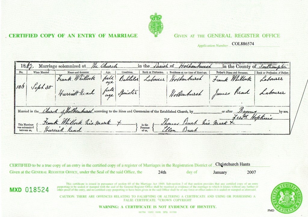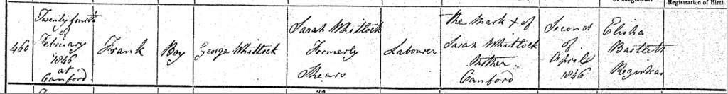My paternal 2nd Great-Grandfather, Frank Whitlock came into the world on Tuesday, the 24th day of February 1846, in the serene village of Canford, Dorset, England. His arrival, noted with care by his mother Sarah, was formally recorded on Thursday, the 2nd day of April 1846, in nearby Poole. Elisha Bartlett, the registrar, meticulously inscribed the details: Frank, a son, born to George Whitlock, a Labourer, and Sarah Whitlock (formerly Shears) of Canford. Sarah, unable to write her name, marked the document with an X, a testament to the times. Among the Whitlock siblings, Frank was the third, following his elder sisters Sarah Ann, born on Sunday, the 21st day of August 1842, in Burley, Hampshire, England, and Betsy, born on Saturday, the 16th day of March 1844, also in Canford, Dorset, England. Their lives intertwined in the simplicity of rural England, amidst fields and meadows that echoed with the rhythms of rural life. For Frank and his family, life revolved around the cycles of nature and the rhythms of labor. George, a laborer, provided for his family through honest toil, while Sarah managed their home with the quiet strength of a rural matriarch.
