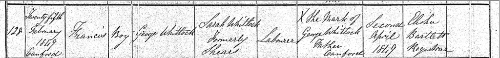 Frank's brother, Francis Whitlock, came into the world on Sunday, the 25th day of February 1849, in their familiar home of Canford, Dorset, England. When the time came to officially register Francis's birth, their father George Whitlock undertook the journey to Poole, Dorset. It was on Monday, the 2nd day of April 1849, that George appeared before Registrar Elisha Bartlett to record the joyous event. With careful detail, Elisha Bartlett documented Francis as a son born to George Whitlock, a Labourer, and Sarah Whitlock (formerly Shears), of Cranford. In a poignant moment, George signed the document with his mark, an X, a testament to his place in a society where formal education was not always accessible.
