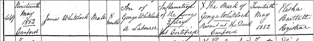 Frank’s younger brother, little James Whitelock, just eight months old, passed away on Wednesday, the 19th day of May 1852, at Canford, Dorset, England. It was a loss that no parent should have to bear. The joy of welcoming a new life had, in what must have felt like the blink of an eye, turned into the sorrow of letting go far too soon. The very next day, on Thursday, the 20th day of May, George Whitelock made the heartbreaking journey to the Poole register office to record his son's passing. With heavy steps and an even heavier heart, he stood before Registrar Elisha Bartlett to give the painful details no father ever wishes to speak aloud. Bartlett carefully entered the loss into the official record, noting that James, just eight months old, the son of George Whitelock, a labourer, had died from "inflammation of the lungs," an illness that had taken hold just two days before. The death was certified, and George, as he had done before, signed the register with his mark, an X, etched with the silent weight of grief. There are no documents that can truly capture the depth of love or the ache of loss. But within this simple record, the Whitelocks’ pain, their strength, and their quiet perseverance live on. Though James’s time in the world was short, his presence left a mark, on his family, in the records, and now, in the hearts of those who remember.