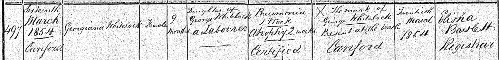 Frank’s little sister, Georgiana, just nine months old, passed away on Thursday, the 16th of March 1854, in Canford, Dorset, England. It was another profound loss for George and Sarah, one that no family, let alone one that had already known such heartbreak, should ever have to endure again. On Monday, the 20th day of March, George made the heart-wrenching journey once more to the register office in Poole, to formally record the death of his baby daughter. The familiar registrar, Elisha Bartlett, gently entered Georgiana’s details into the register. He recorded that she was the daughter of George Whitelock, a labourer, and that she had died from pneumonia, which had gripped her tiny body for one week, and atrophy, endured for two. Her death was officially certified. Though Georgiana’s birth had been recorded under the surname Whitlock, her passing was entered as Whitelock, yet another shift in the family’s ever-changing name, a reflection perhaps of clerical inconsistency, or the spoken word interpreted by the registrar’s ear. But no matter the spelling, her identity as a cherished daughter, sister, and soul forever woven into the Whitlock family's story remains unchanged. Her short life, bookended by love and loss, leaves behind more than sorrow, it leaves behind a thread of memory, stitched quietly into the hearts of those who came after. Georgiana’s name lives on in the records, but more importantly, in the remembrance of a family’s strength, and the enduring tenderness that carries the lost ones with them, always.