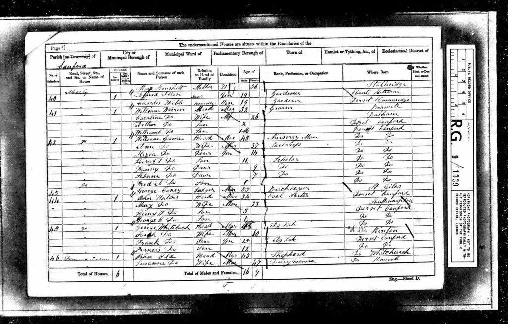 On the day of the 1861 census, Sunday the 7th day of April, 15-year-old Frank was living at Merley, a peaceful corner of Canford, Dorset, with those closest to him, his parents and younger brother. That spring day, the family was recorded under the name *Whitelock*, one of the many variations their surname would take across the years. These small changes in spelling, scattered across records and time, have made the task of tracing their journey all the more delicate, but all the more rewarding. Frank, just stepping into manhood, was already contributing to the household, working as an agricultural labourer beside his father, George. At 63 years old, George was still in the fields, his hands and back shaped by decades of labour. Frank’s path would likely have followed his father’s, long hours in the Dorset soil, hard work rewarded by survival more than comfort. His mother Sarah, now 60, remained the heart of their home, having endured both the daily struggles of working-class life and the quiet grief of losing three young children. Twelve-year-old Francis, Frank’s younger brother, was still in boyhood but on the cusp of shouldering his share of the family’s burdens. It’s easy to imagine him looking up to Frank, seeing in him both an older brother and a teacher, someone to follow into the furrows of the field and the responsibilities of life. The census recorded that the Whitelocks were inhabiting the whole building, perhaps a modest home by today’s standards, but in those times, a full dwelling to oneself was a small but meaningful measure of stability. It was a space that held their daily lives, their quiet moments, and the legacy they were unknowingly leaving behind for those of us who would one day look back. This was Frank’s world at fifteen, a life of toil, yes, but one surrounded by kin, and set against the backdrop of the Dorset countryside he would always call home. His story was already unfolding in quiet, steadfast chapters, each census, each document, each memory a step further along the path he was walking.