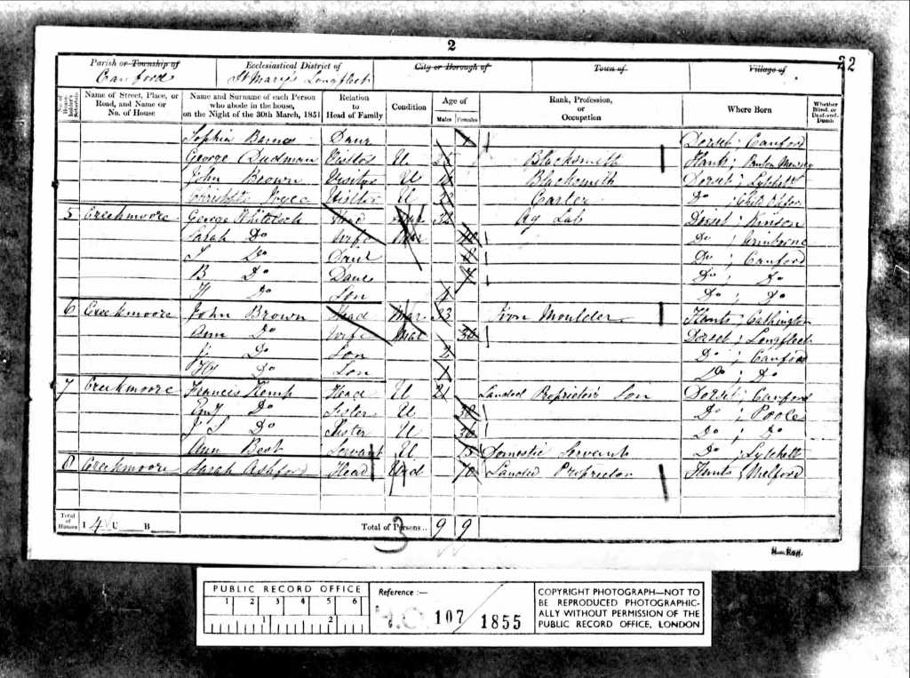 On the eve of the 1851 census, Sunday the 30th day of March, 4-year-old Frank Whitelock was living with his parents, George and Sarah, and his sisters, Sarah Ann and Betsy, at Creekmoor in Cranford, Dorset, England. Nestled on the edge of Poole, Creekmoor was then a quiet rural settlement, far from the bustling suburb it would one day become. George, the head of the household, listed his occupation as an agricultural labourer, an honest trade tied to the soil and seasons, reflective of the life so many families like the Whitelocks lived in the Dorset countryside. Though the family had welcomed another child, baby Francis, in 1849, his name was not recorded in the 1851 census. Whether this was due to a clerical omission, illness, or the possibility that he was elsewhere at the time, his absence leaves a quiet gap in the family’s recorded story, a reminder of how incomplete records can sometimes obscure the lives that once were. Notably, the surname recorded for young Frank and his family, in the census was Whitelock, diverging from the name Whitlock that had been used when his birth was officially registered. This variation in spelling would follow the family through generations, weaving a subtle complexity into the threads of their story. In a time when literacy was limited and clerks often spelled names by sound, such changes were not uncommon but they can turn a straightforward lineage into a genealogist’s puzzle. Still, there they were in Creekmoor, George and Sarah, raising their children amid the rhythms of rural life, working the land, and doing their best to build a life in a world slowly transforming around them. For young Frank, these early years were shaped by family, faith, and the humble surroundings of Dorset’s countryside, long before his own story would take its place in the unfolding legacy of the Whitlock/Whitelock name.